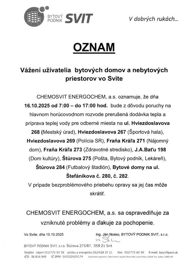 bude prerušená dodávka tepla a teplej úžitkovej vody z dôvodu poruchy u dodávateľa CHEMOSVIT ENERGOCHEM, a.s. Svit.